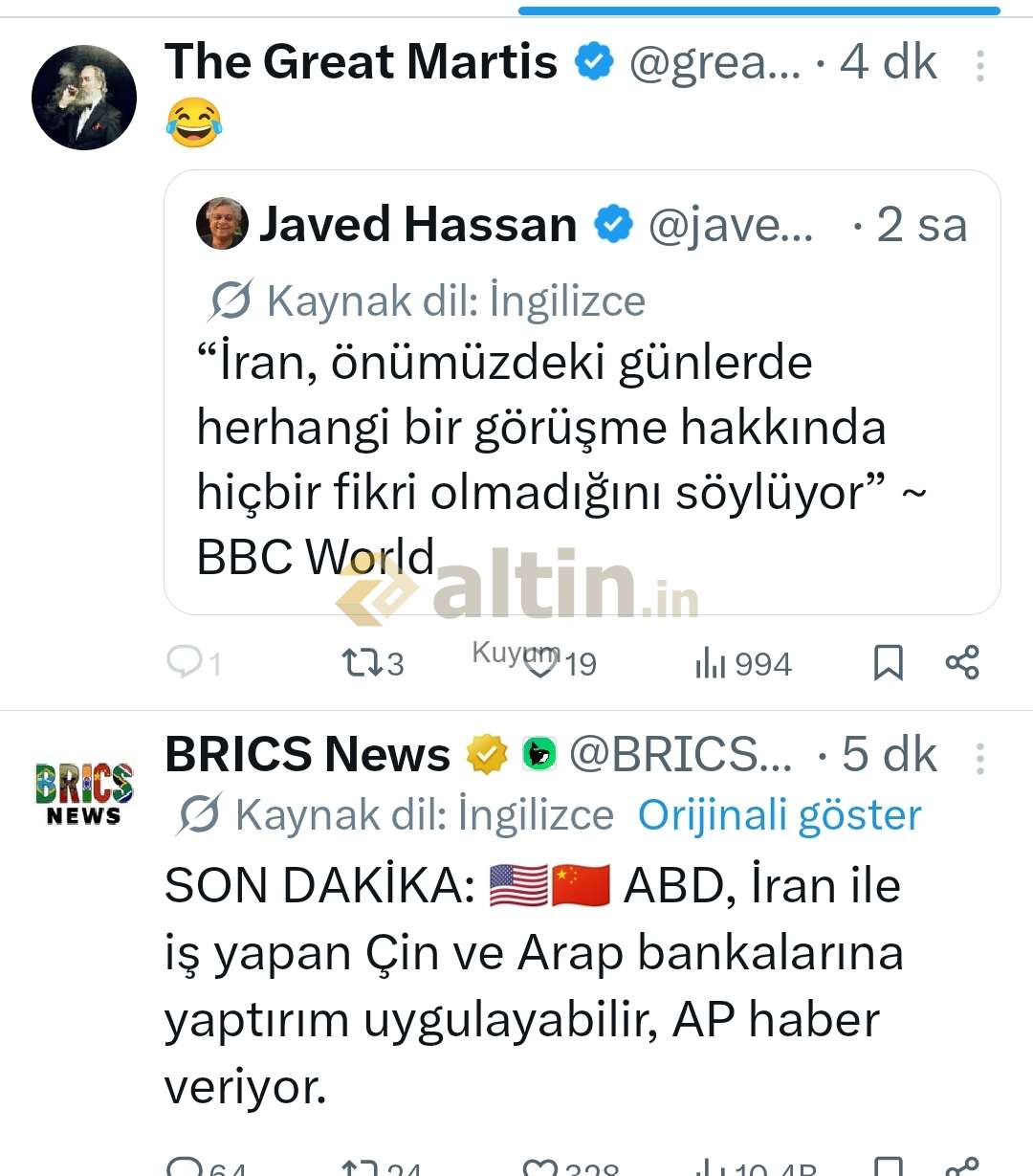 1) Altin.in'de yer alan içeriğin doğru ve/veya güncel olduğu hiçbir şekilde iddia veya garanti edilmemekte, hiçbir veri ve/veya paylaşım, yatırım danışmanlığı kapsamına girmemektedir. Sitenin içeriği referans alınarak yapılacak hiçbir işlemin doğuracağı maddi ve/veya manevi herhangi bir kayıptan altin.in sorumlu değildir. 2) Altin.in ziyaretiniz sırasında ip adresiniz ve bilgisayarınız aracılığıyla toplanabilen diğer veriler altin.in tarafından kayıt altında tutulmaktadır. 3) Altin.in tüm içeriği önceden uyarmaksızın değiştirme, kaldırma ve yenilerini ekleme hakkına sahiptir. 4) Altin.in gerekli gördüğü taktirde üyelerin ip numaralarını engelleme hakkına sahiptir. 5) Altin.in yorumlar bölümünde ki içerik, görsel, yorum ve paylaşımlar (tarafımızdan onaylanmaksızın) kullanıcılar tarafından kendi iradeleri ile paylaşılmaktadır. Bu içeriklerden dolayı doğabilecek hukuksal konulardan içeriği oluşturan kullanıcı sorumlu olacaktır. 6) Altin.in'in tüm kullanıcıları 5651 Sayılı Kanunun 8. ile 9. Maddesine ve TCK'nın 125. maddesine göre yaptıkları paylaşımlardan kendileri sorumludur. Bu bağlamda altin.in hukuksal haklarını saklı tutar. 7) Bu uyarılar önceden haber verilmeksizin değişkenlik gösterebilir takibi kullanıcılarımızın sorumluluğundadır.