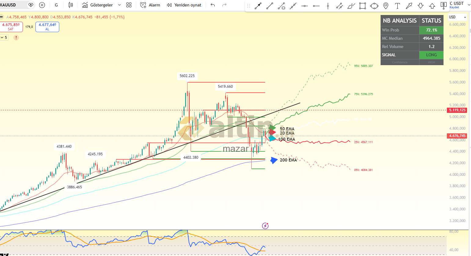 Telafi_ ()Ustam elin kolun dert görmesin. Emeğine sağlık. 4682 ve 4694 rakamları saatlik ve yarım saatlikte benim için önemli. 4 saatlikte 4694. RSI saatlikte nötr. beklenen düzeye mi çıkar yada düşer mi onun peşine düşeceğim. Nasip artık Geçen ki gibi üçgen altına düşmeden yukarı atabilecek mi. Atarsa 4800 ler gündeme gelebilir Yoksa bir alt mı. Siz zaten kademeleri ve olasılıkları yazmışsınız. Ytd Rast gele