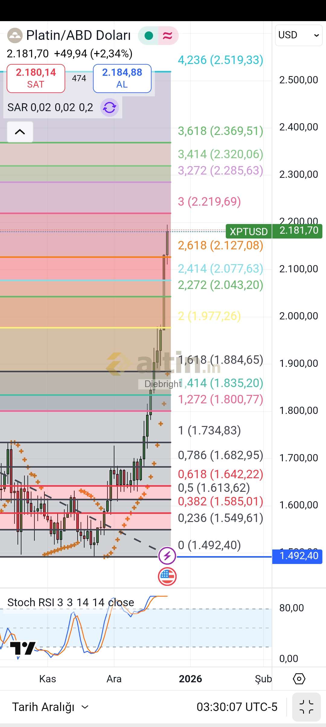 2219.69 fibo hedefi var. Günlük gösterge aşırı alıma geldi. Biraz geri çekilse söyle 2127 usd 2077 usdleri test etse iyi olur. Fakat orta uzun vade platin bana göre 2519 usdleri dahi görebilecek potansiyele sahip.