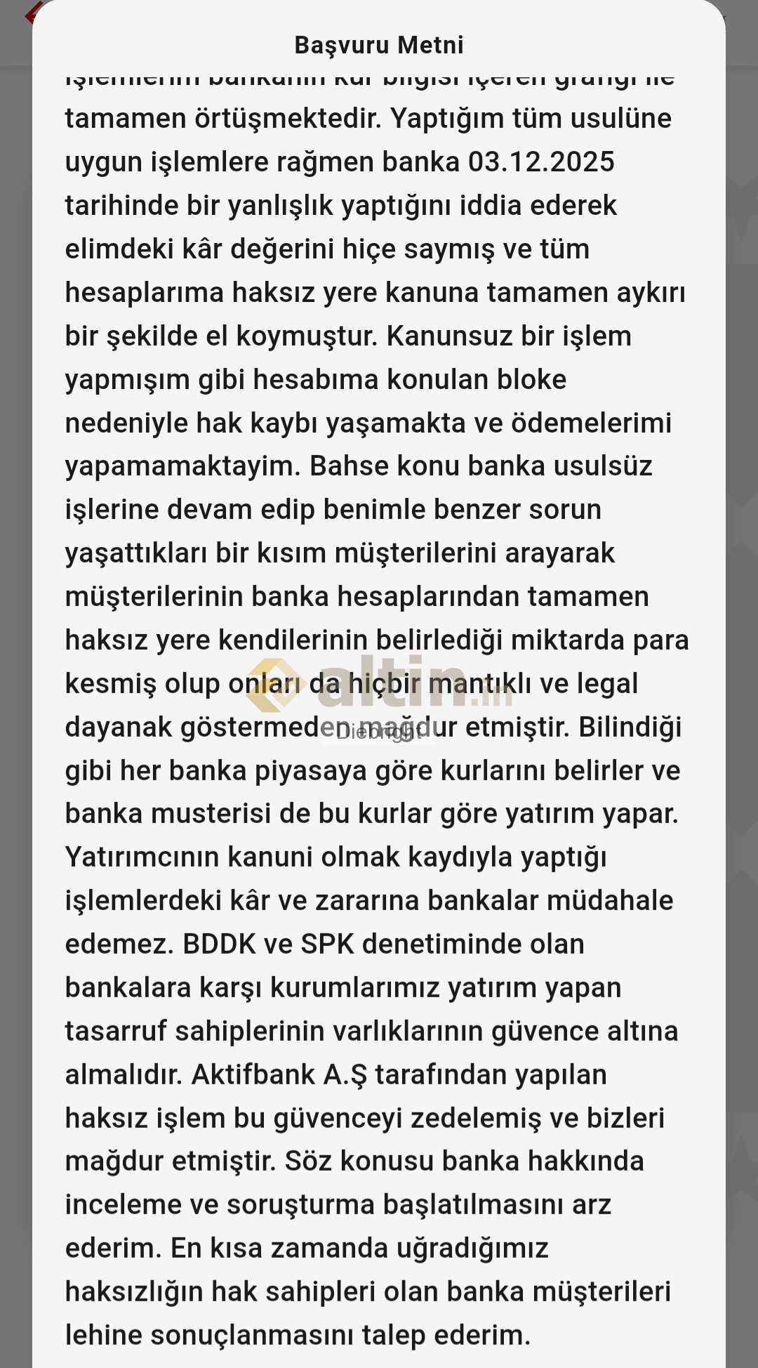 Diebright ()Aynen bddk bana da 1 ay bulabilir dediler. Para rehin kalacak orada. Bunlar parayı isletebilecek mi mesela? Var mı böyle bir hakları? Bankanin yaptığı tüm hareketler ve bizim islem hareketlerimiz bence denetlenmeli. Bddk normalde bankaya değil sürece kendi müdahil olmalıydı. Banka hareketlerine bakilsa bizden yana kesinlikle usule aykiri bir islem bulamazdı.