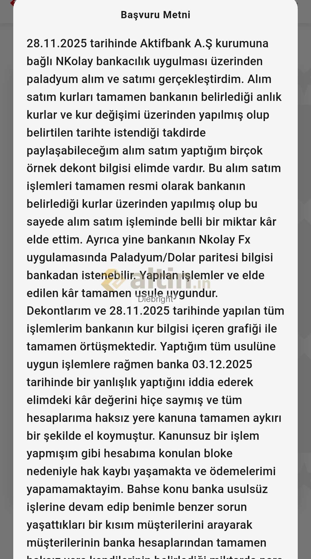 Diebright ()Aynen beni cuma hanıma ara diyip hanımı musteri temsilcisi ile gorusturdukten sonra bir daha atamadılar. Sadece mesaj atıp 28.11.2025 tarihinde yaptığınız yatırım islemleri için bizi arayın dediler. Ful hesap bloke hicbir islem yok. Para olduğunu gibi duruyor. Fx ve arbitraj sayfasında sadece garip garip değişiklikler yapıyorlar. Bunlar musteri ile yaptiklari telefon görüşmesinden kendilerine sonrasi için nasil bir hak çıkaracaklar bakalım. Sizin için inşallah o arada paladyum fazla dusmez. Hoş para kurtulsun da gerisi bence mühim değil.